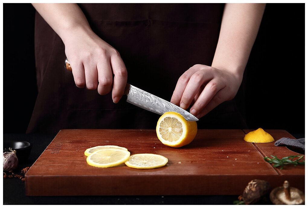 Отзывы на Кухонный нож «Универсал» TuoTown U125 TWRY-D3 TUOTOWN, рукоять темнный акрил+дерево, клинок 12,5 см (VG10-Damascus).