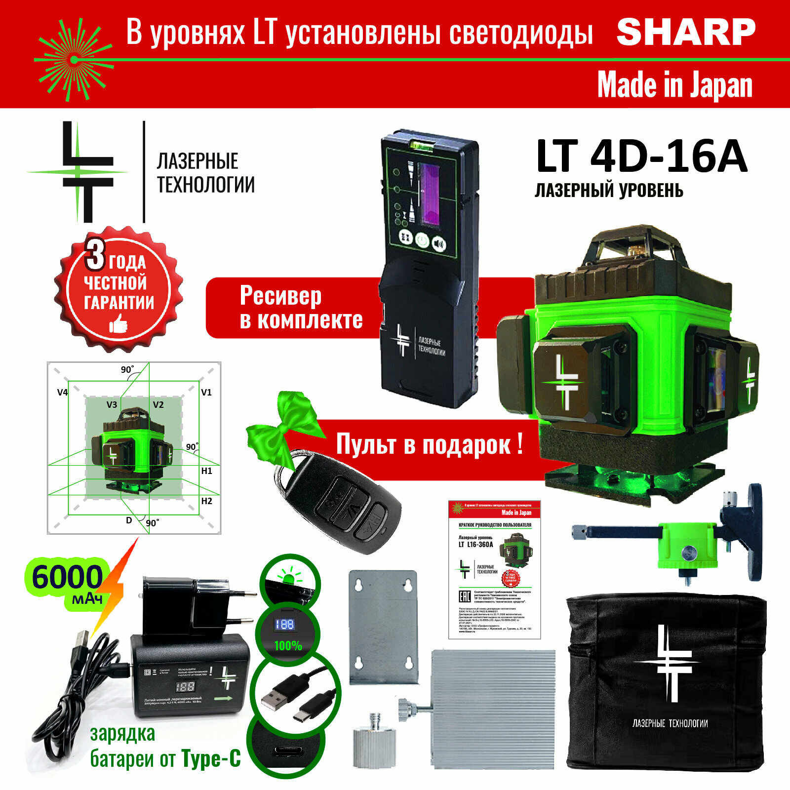 Профессиональный Лазерный уровень (нивелир ) LT L16-360А 16 линий 4D + Приемник лазерного луча (отражатель) информация: