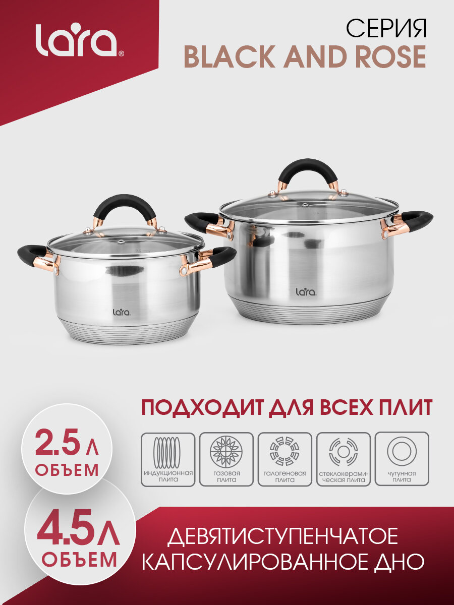10 цен на LR02-116 Набор посуды LARA серия BLACK and ROSE 4 пр. (2.5+4.5л) индукц. 9-ти ступ. капс. дно