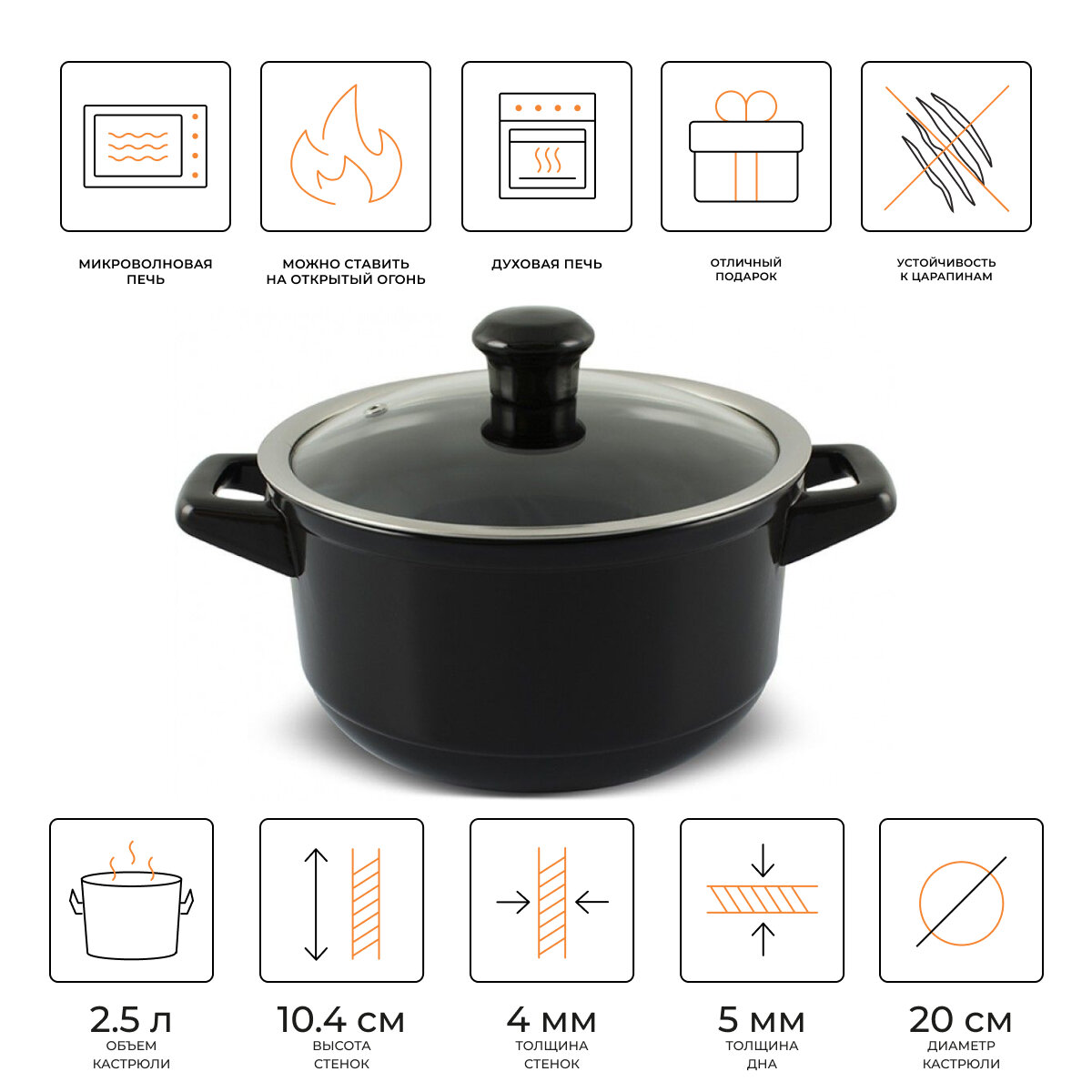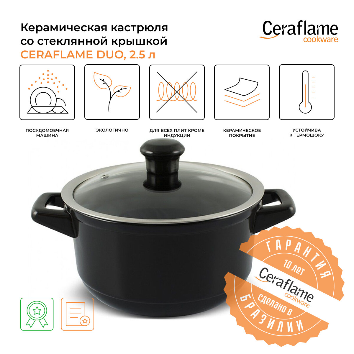 Кастрюля керамическая со стеклянной крышкой Ceraflame Duo 20 см, 2.5 л, чёрный информация: