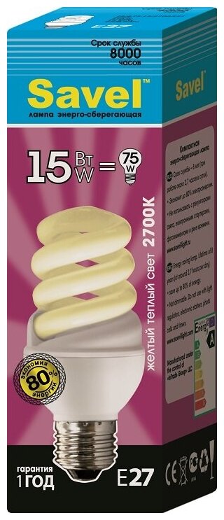 Отзывы на Лампочка Savel FS/8-T3-15/2700/E27, Желтый свет, 15Вт, E27, Люминесцентная (энергосберегающая), 1 шт.