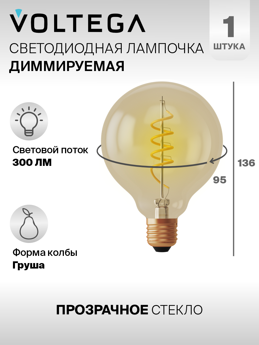 VOLTEGA Лампа светодиодная диммируемая Voltega E27 4W 2800К прозрачная VG10-G95GE27warm4W-FB 7076