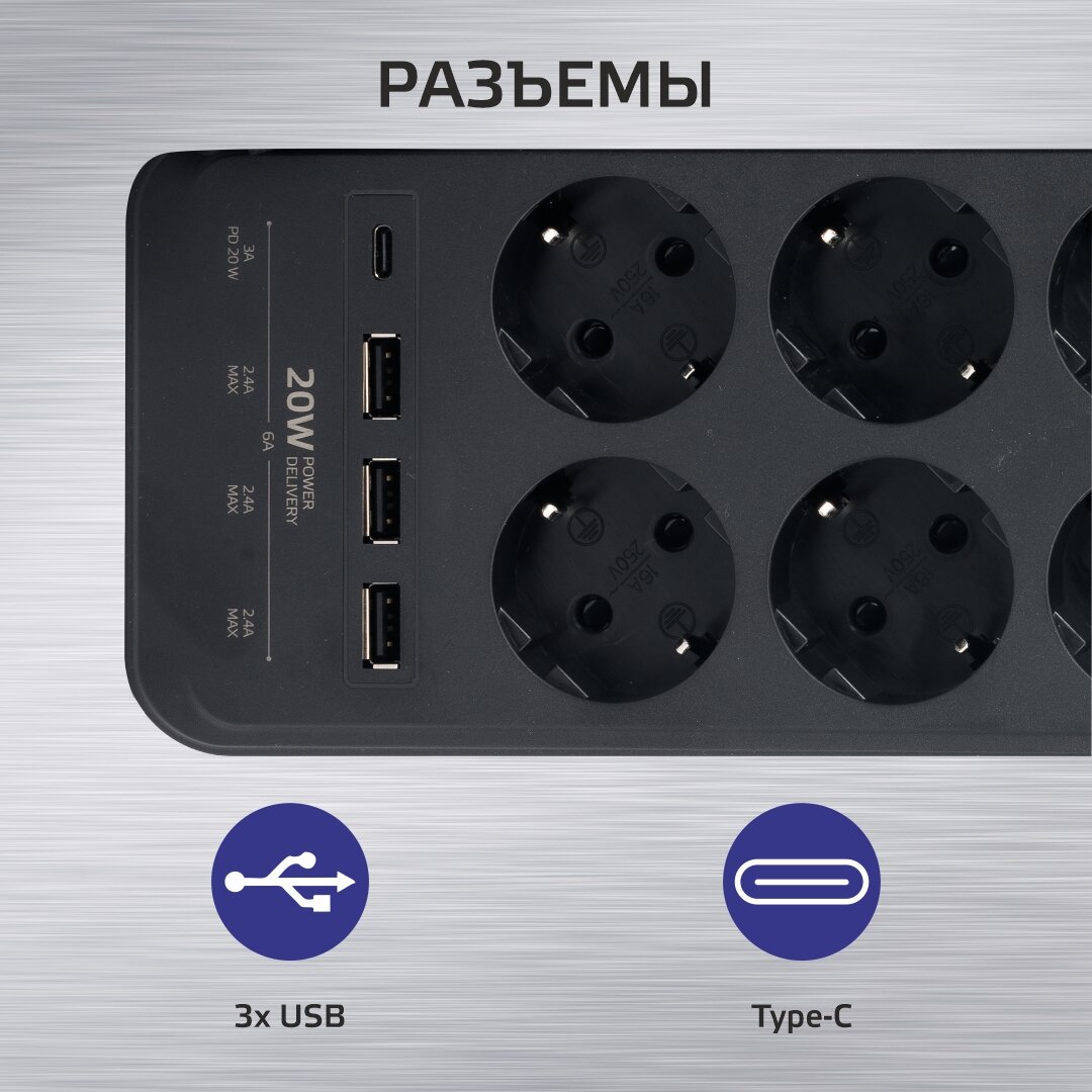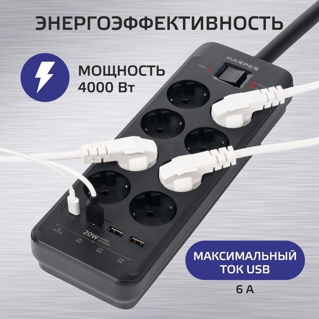 Harper Харпер Сетевой фильтр с USB зарядкой UCH-650 Black PD3.0 8 роз.,5м.,3xUSB+1xType-C портами, 4000W 5 383 ₽