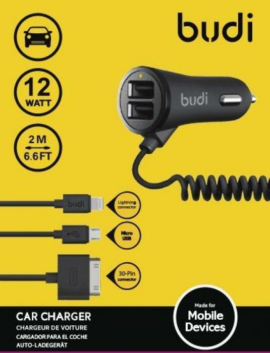 10 цен на Автомобильное зарядное устройство Budi Car Carger 2 USB with 30 pin / Micro USB / Lightning Cable