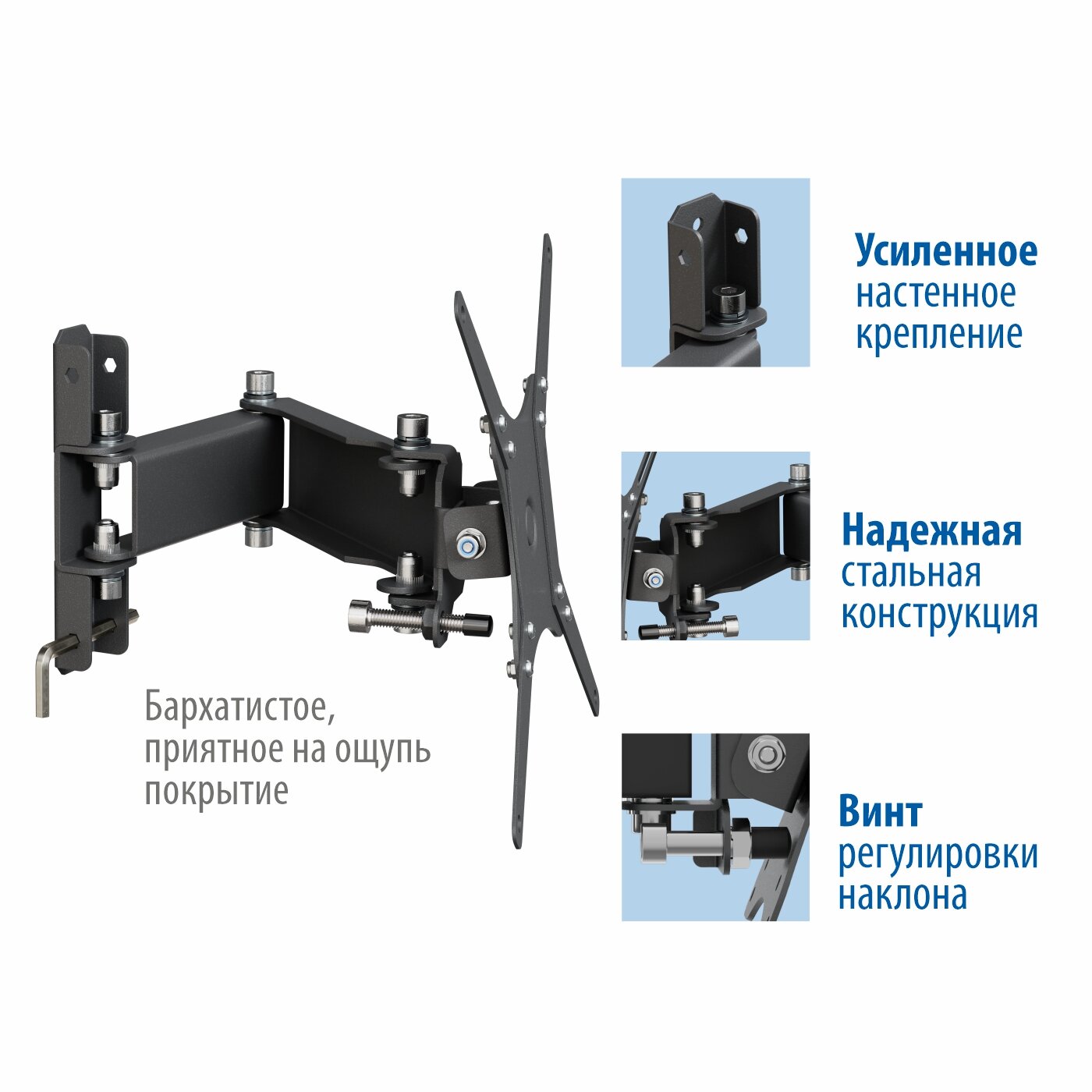 Надежный настенный кронштейн РЭМО K-543, наклонно-поворотный 15"-43", крепление VESA 75*75, 100*100 и 200*200 мм