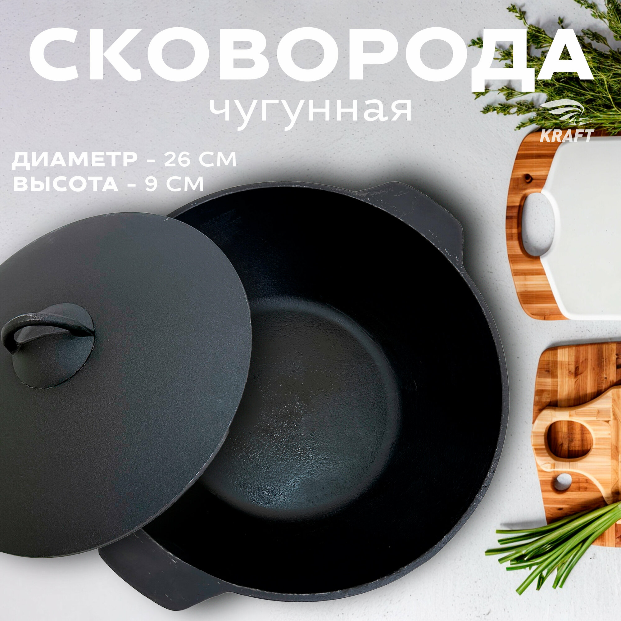 Отзывы на Сковорода чугунная 26 см с литыми ручками "ушками" с крышкой, высота стенки 9 см