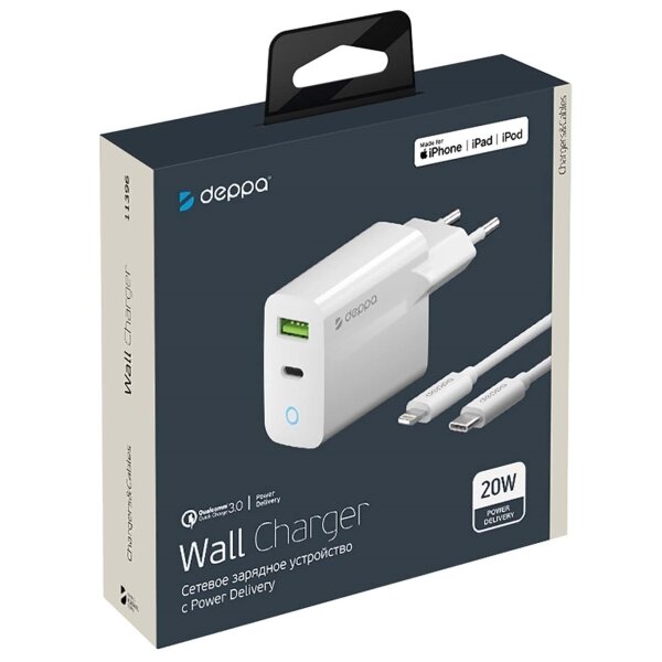 Сетевое зарядное устройство USB Type-C, Power Delivery, 20Вт, белый, Deppa, крафт, Deppa 11424-OZ