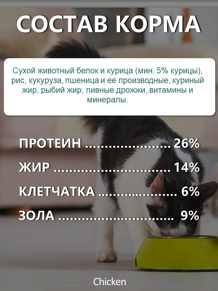 | Состав | Сухой животный белок и курица (мин. 5% курицы), рис, кукуруза, пшеница и ее производные, куриный жир, рыбий жир, пивные дрожжи, витамины и минералы. |