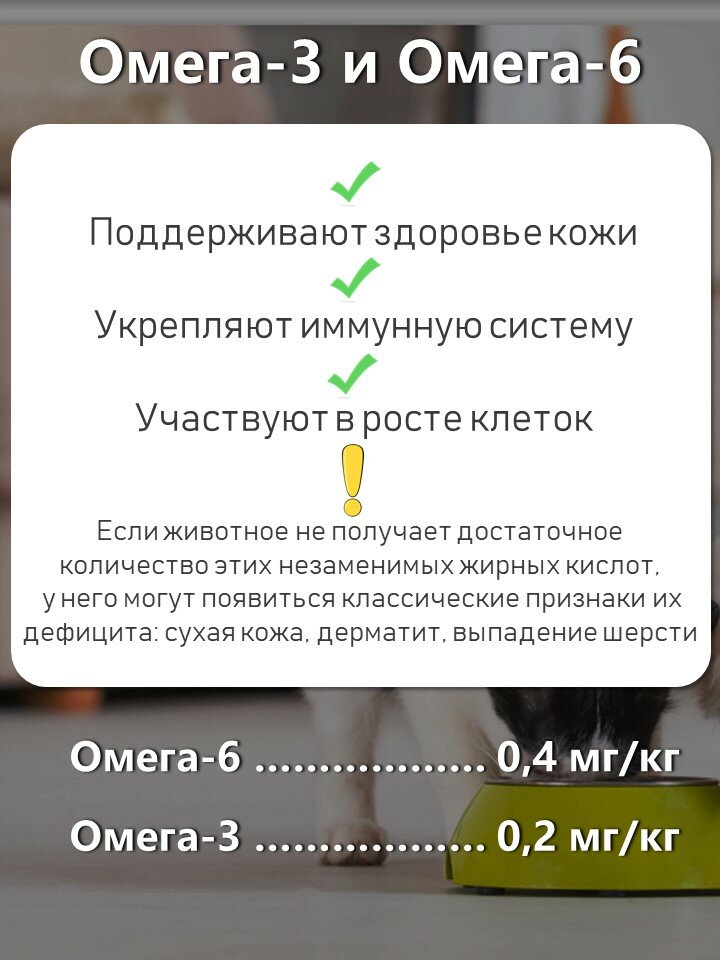 | Дополнительная информация | влажность 8,00%, сырой протеин 26,00%, сырой жир 14,00% сырая клетчатка 6,00%, сырая зола 9,00%, кальций 2,00%, фосфор 1,00%, натрий 0,50 %, омега 3 – 0,20 мг/кг, омега 6 – 0,4 мг/кг |