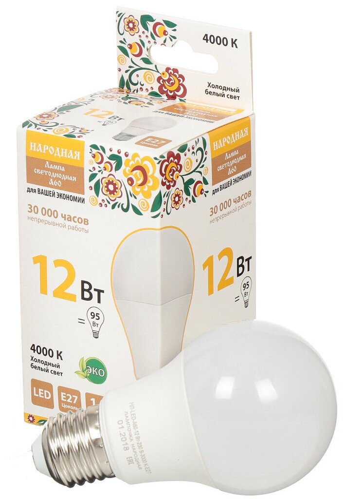 Отзывы на Лампа светодиодная НЛ-LED-A60-12 Вт-230 В-4000 К-Е27, (60х108 мм), Народная