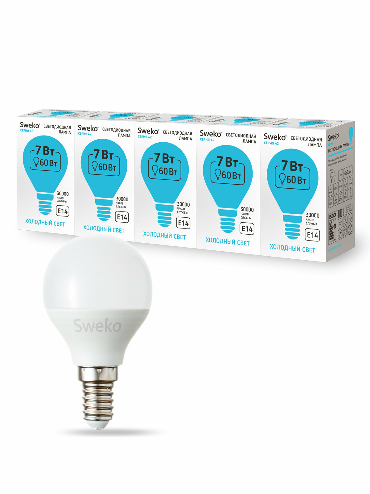 Комплект из 5 штук. Sweko Светодиодная лампа Серия 42 шар матов G45 E14 7W(650lm) 4000K 81х45 информация: