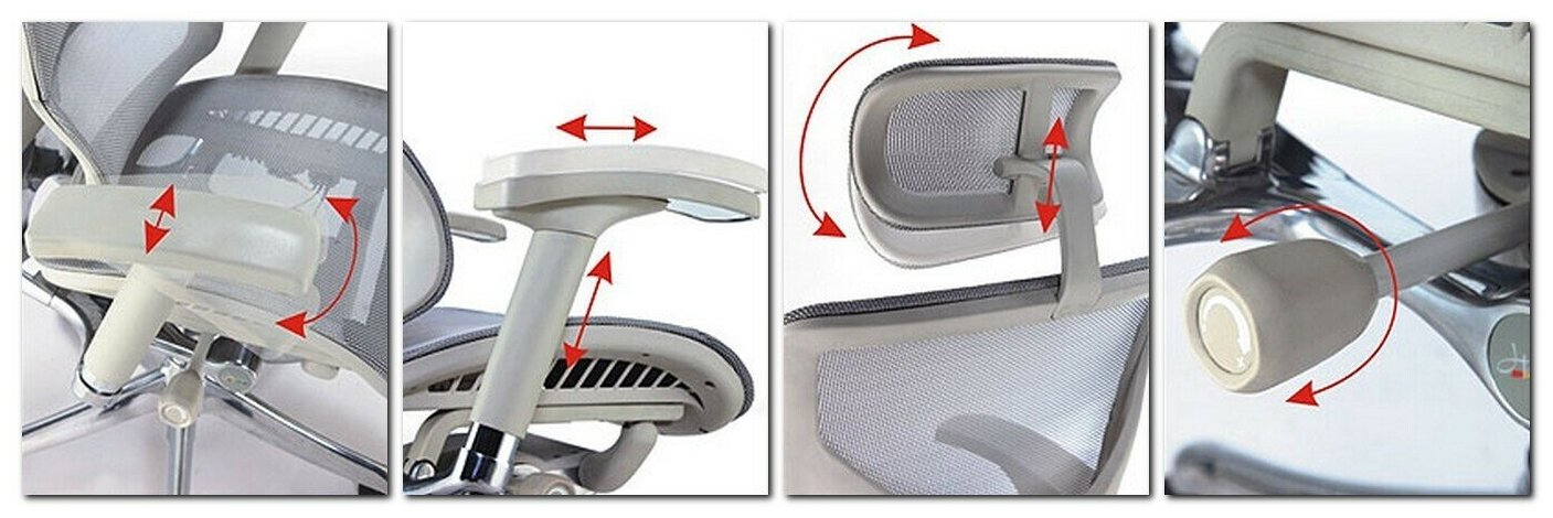 | Регулировка | высоты подголовника / высоты подлокотников / высоты поясничного упора / высоты сиденья / высоты спинки / глубины положения подлокотников / глубины сиденья / жесткости качания / наклона спинки / расстояния между правым и левым подлокотником |