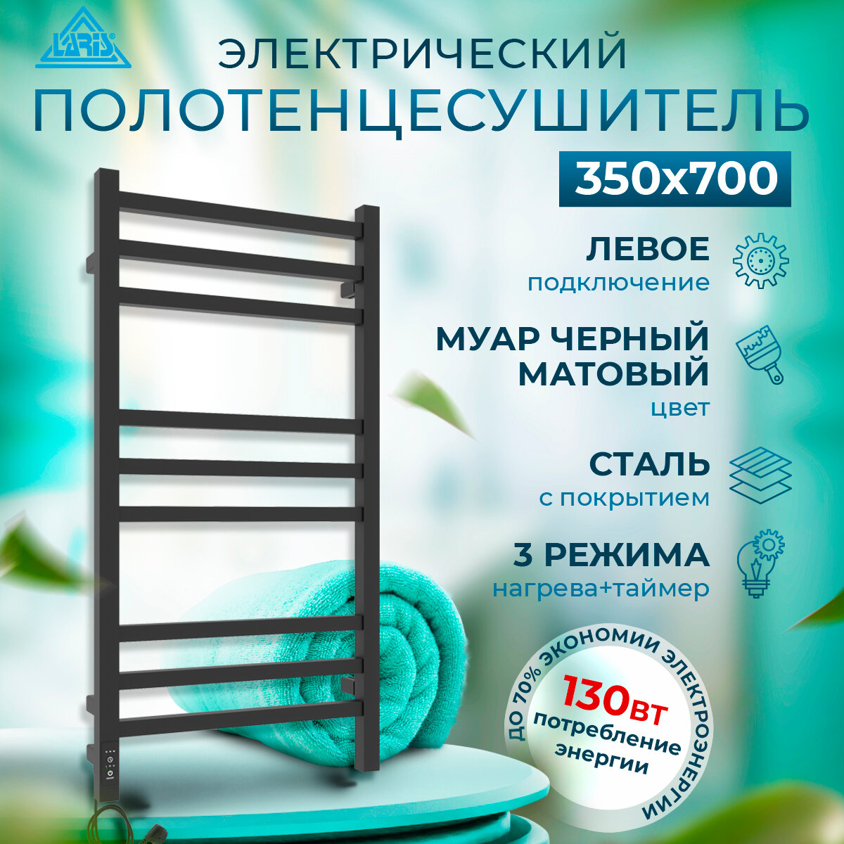 Полотенцесушитель электрический Laris Астор ЧКЧ9 350мм 700мм левое подключение RAL 9005 (черный матовый) информация: