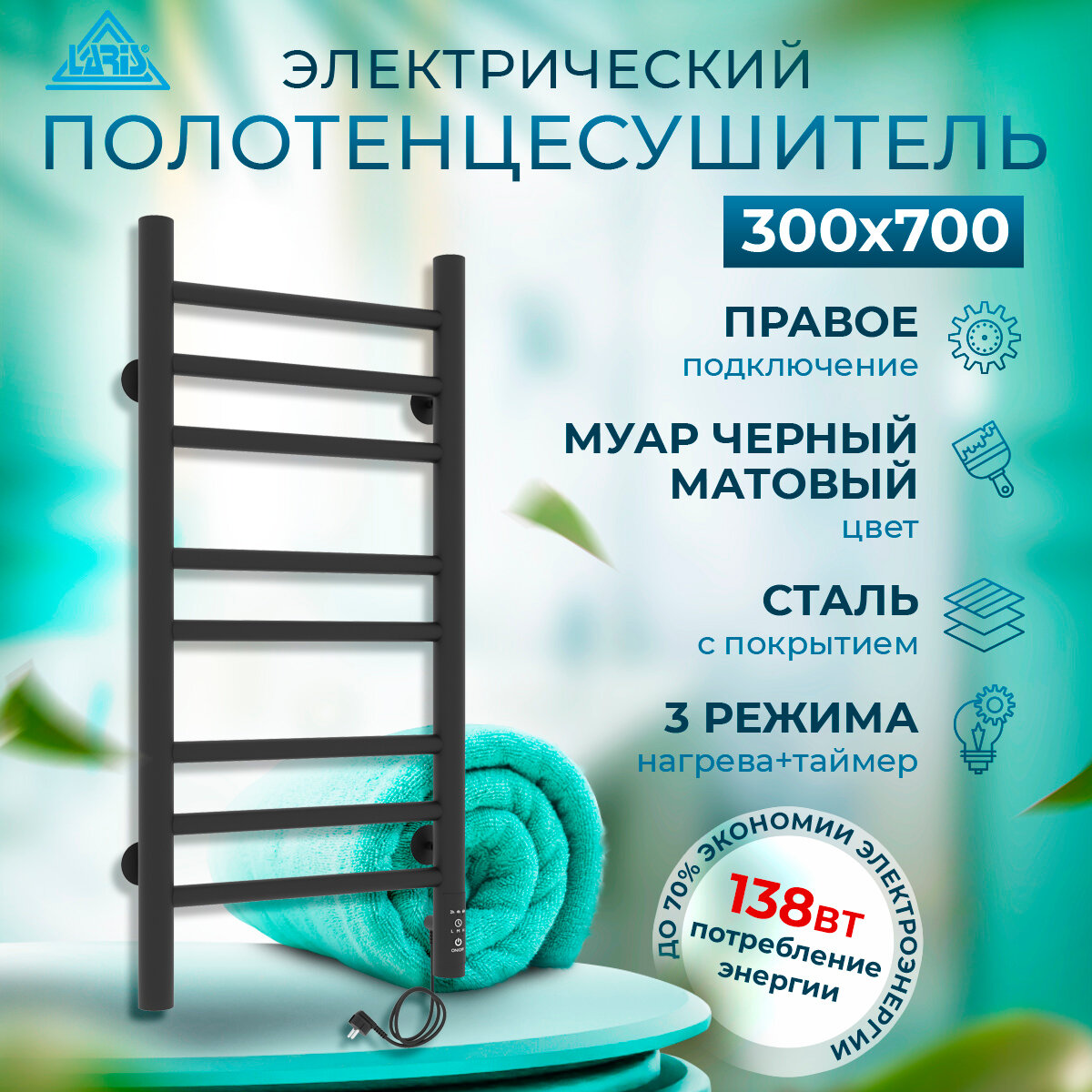 Полотенцесушитель электрический Laris Лаванда ЧКЧ П8 300х700 мм правое подключение RAL 9005 (черный матовый муар) с таймером и терморегулятором информация: