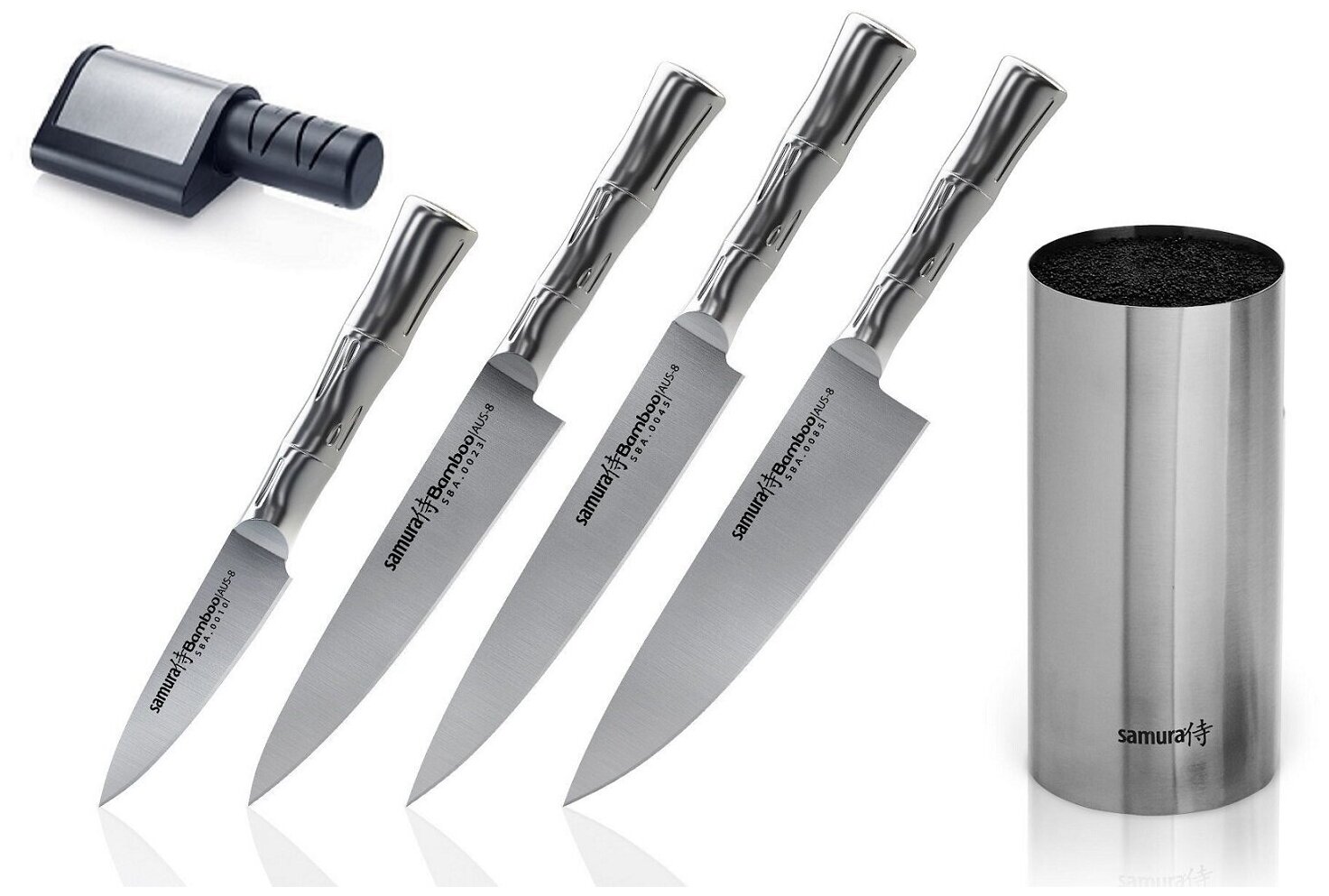 10 цен на SBA-0240МЕТПЭЛТЧ набор из 4-Х кухонных ножей SAMURA BAMBOO металлической подставки и электрической точилки с алмазным напылением на дисках