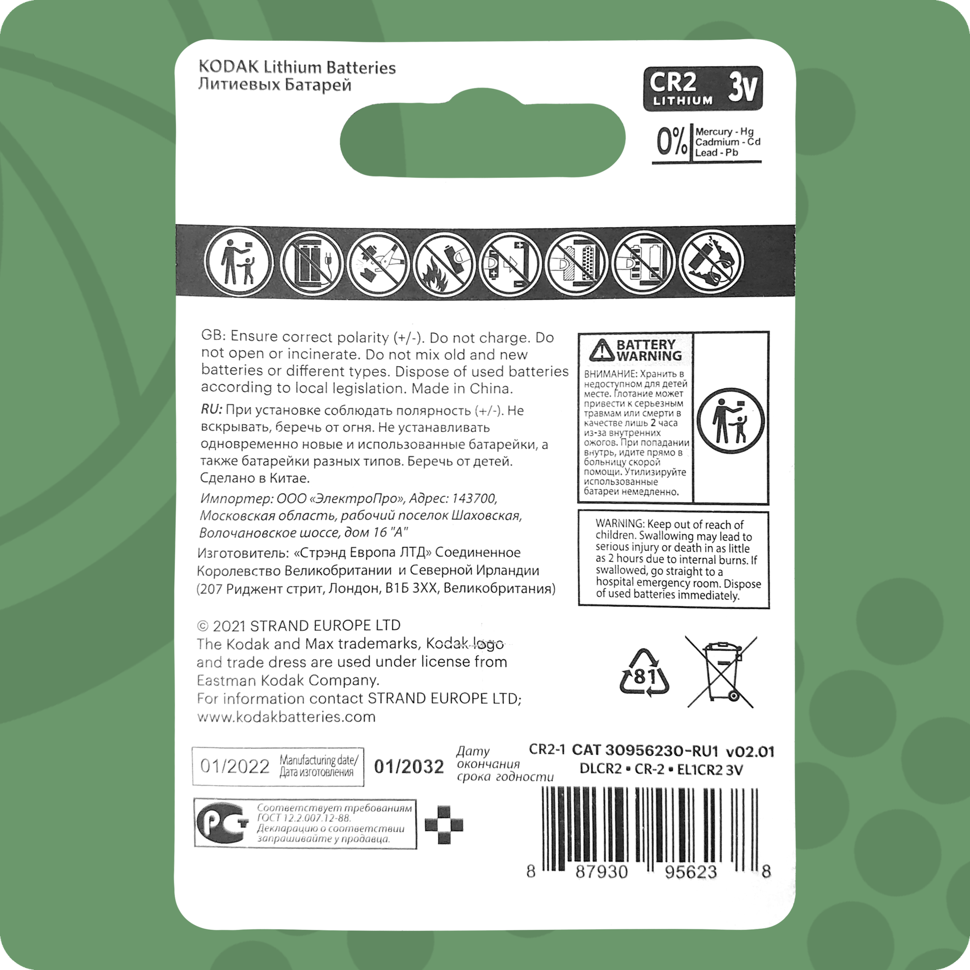 Батарейка CR2 3V Kodak, 2 шт. информация: