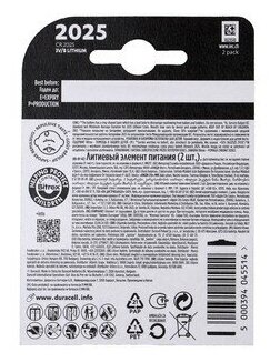 DURACELL Б0037272 DURACELL CR2025-2BL Литиевые батарейки, блистер 2 шт информация: