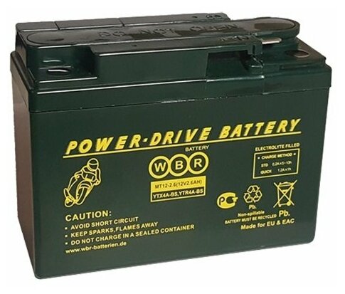 Аккумулятор WBR MT 12-2.6 для мототехники (12В, 2.6Ач / 12V, 2.6Ah / стартерный ток 45А) YTX4A-BS информация: