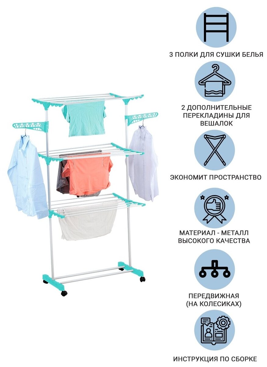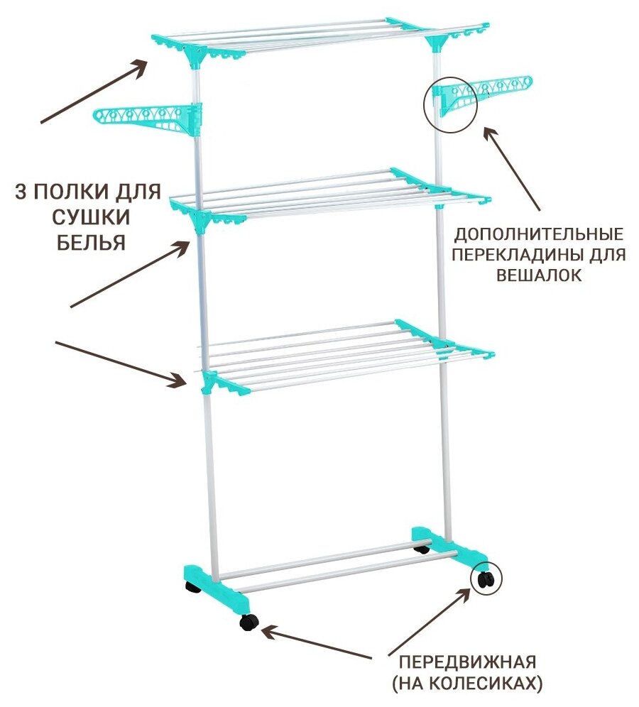 Сушилка для белья на 3 полки с перекладинами для вешалок Homsu