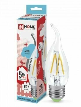 Светодиодная лампа IN HOME led-свеча на ветру-deco 5Вт 230В Е27 4000К 450Лм прозрачная 4690612007656
