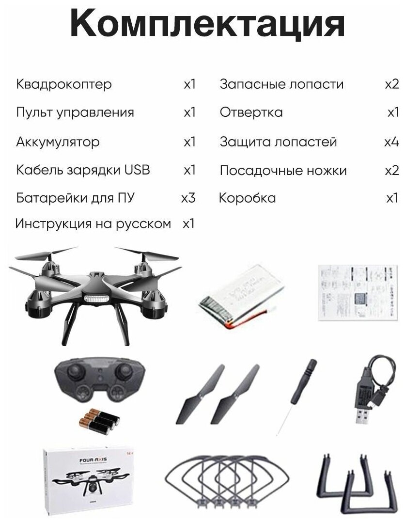| Комплектация | Квадрокоптер без камеры-1шт, пульт д/у-1шт, аккумулятор-1шт, батарейки ААА для пульта-4шт, запасные лопасти-2шт, защита для лопастей-4шт, посадочные ножки-2шт, отвертка-1шт, шнур для зарядки аккума-1шт, коробка-1шт. |