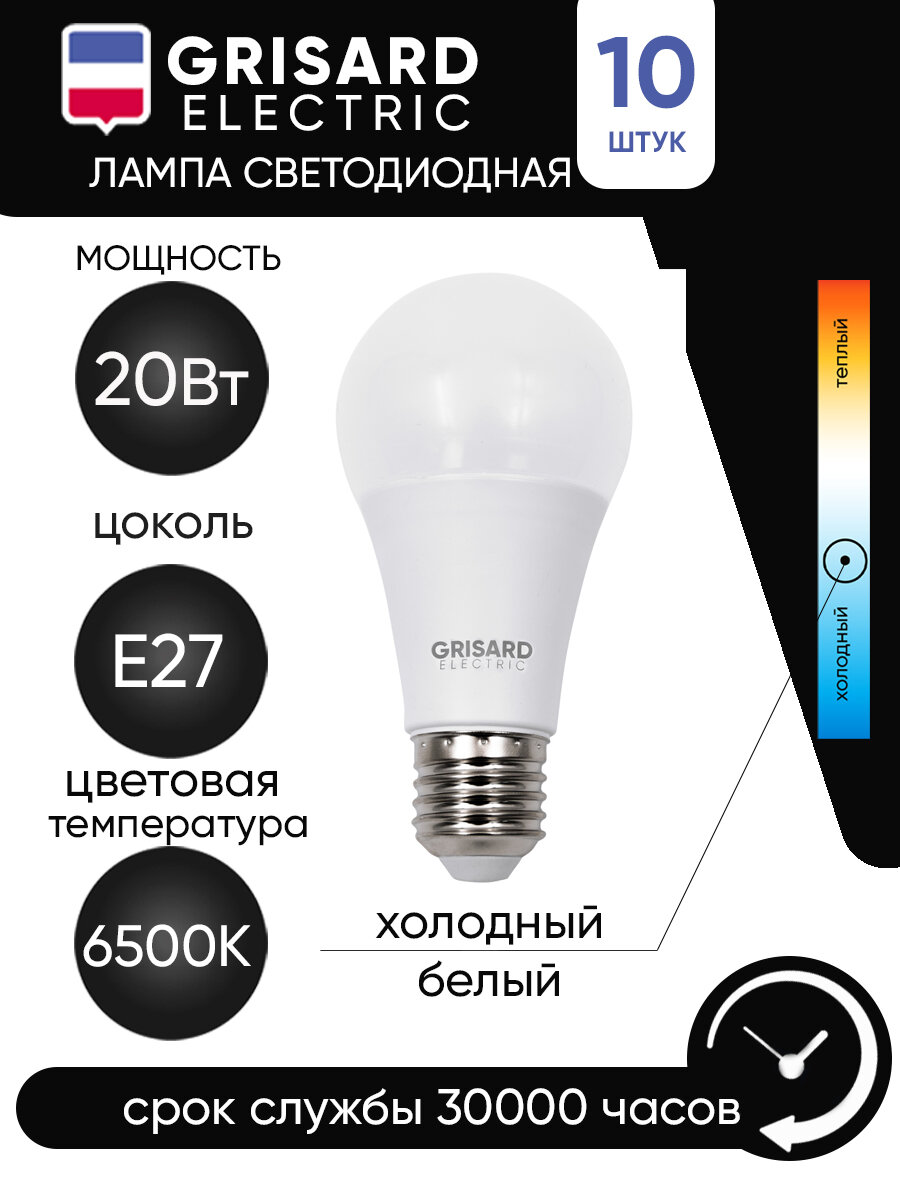 Лампа светодиодная GRISARD ELECTRIC шар A60 Е27 20 Вт 6500К 220В 10шт информация: