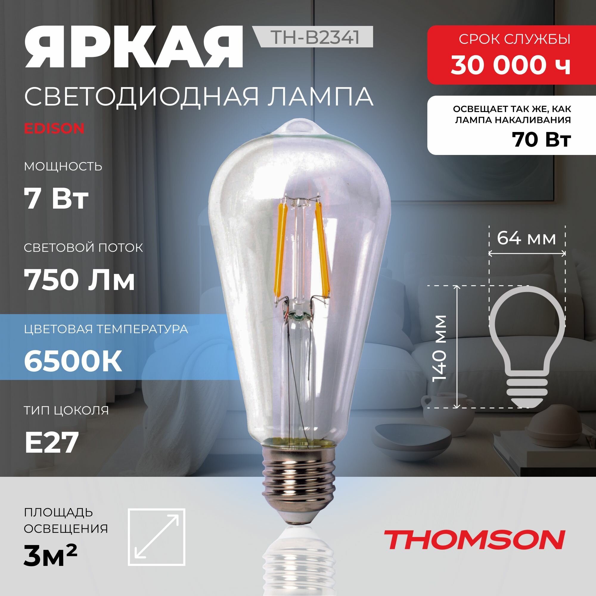 Лампочка Thomson филаментная TH-B2341 7 Вт, E27, эдиссон, 6500K, ST64, холодный белый свет