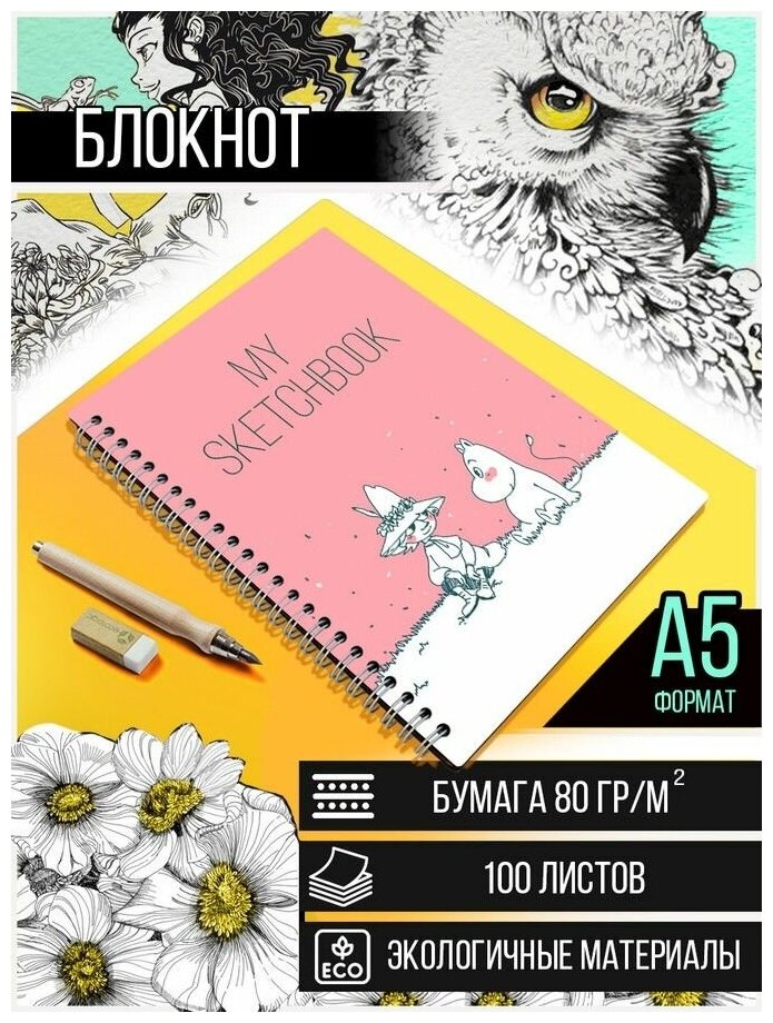 10 цен на Скетчбук Блокнот, A5 50 листов с деревянной обложкой мультфильмы муми тролли moomin - 1110