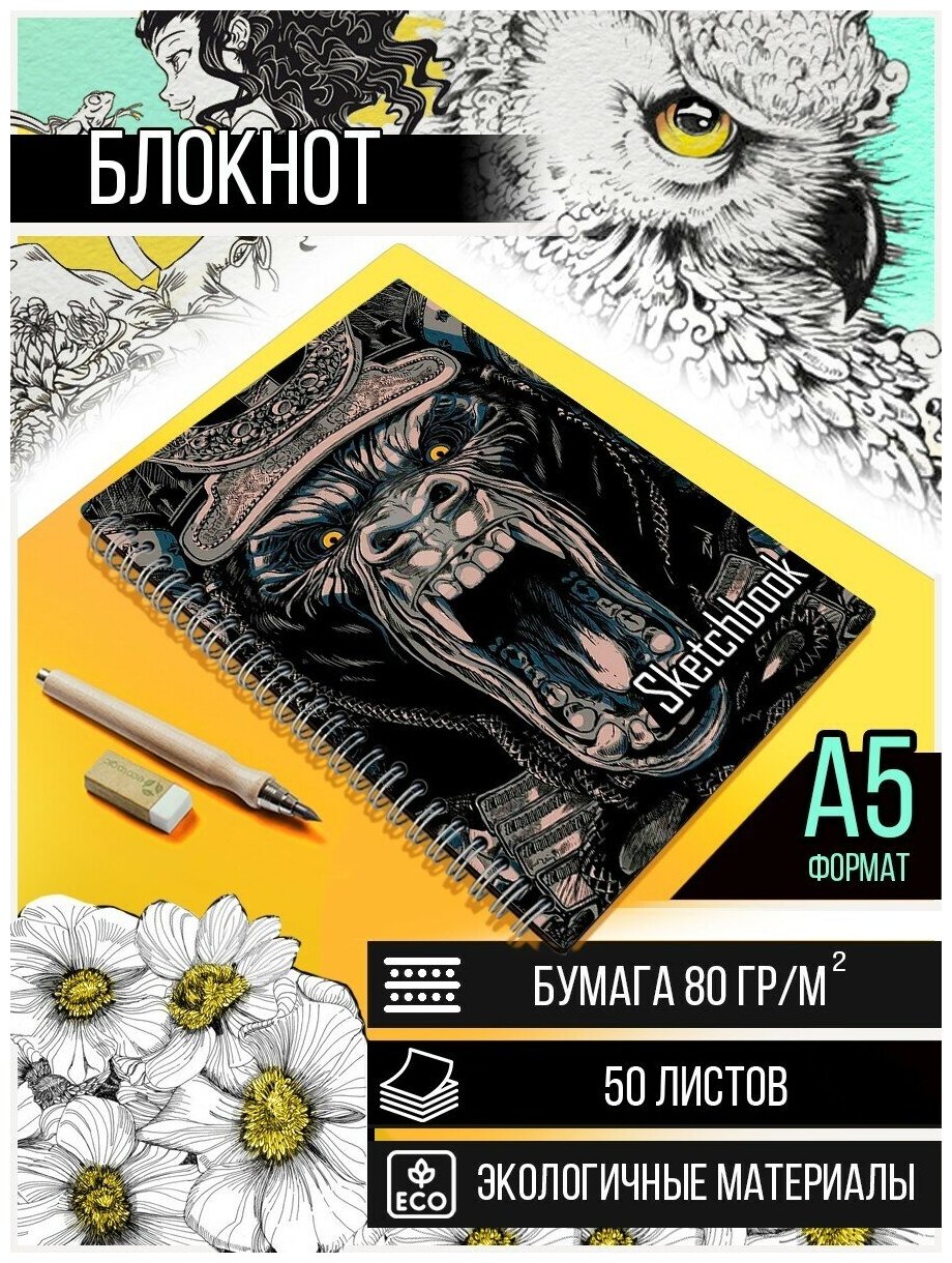 Скетчбук А5 50 листов Блокнот для рисования Обезьяний лорд (Самурай, крик, экспрессия, азиатская эстетитка) - 220 В информация: