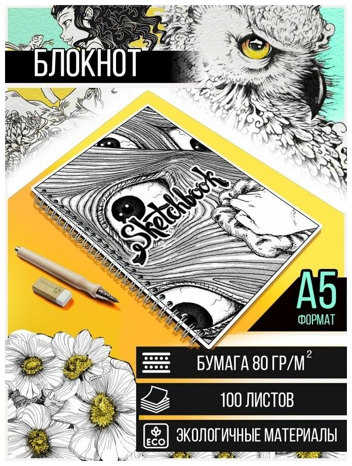 10 цен на Скетчбук Блокнот, A5 50 листов с деревянной обложкой манга психоделика - 335