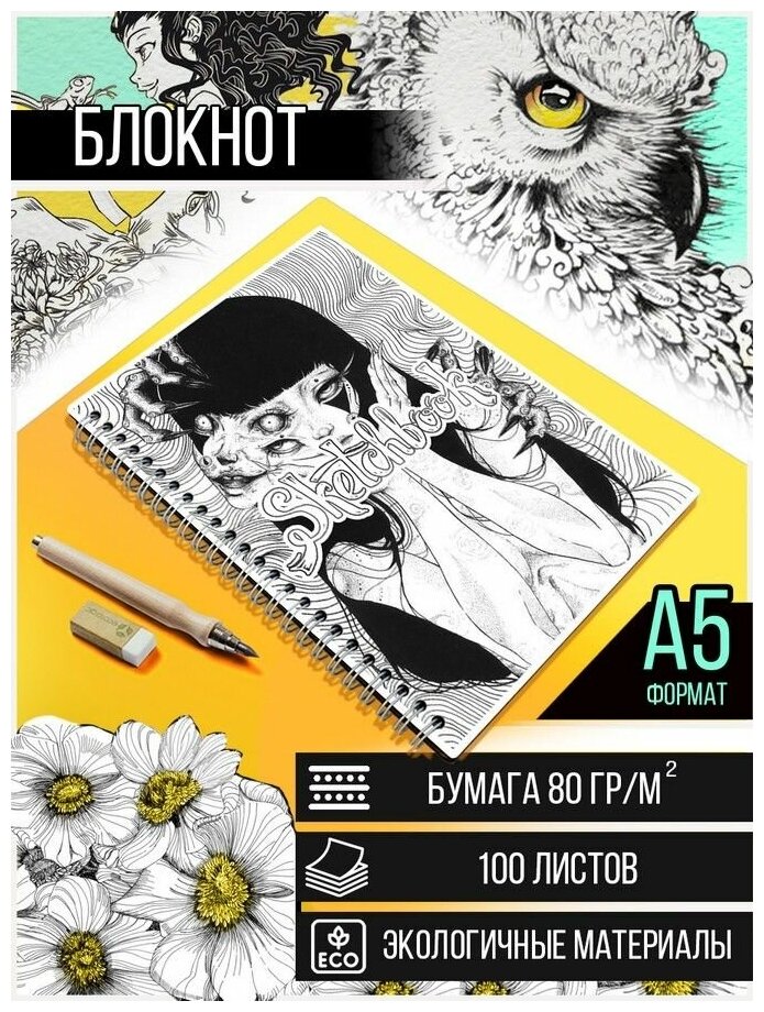 10 цен на Скетчбук, Блокнот, A5 50 листов манга психоделика - 333