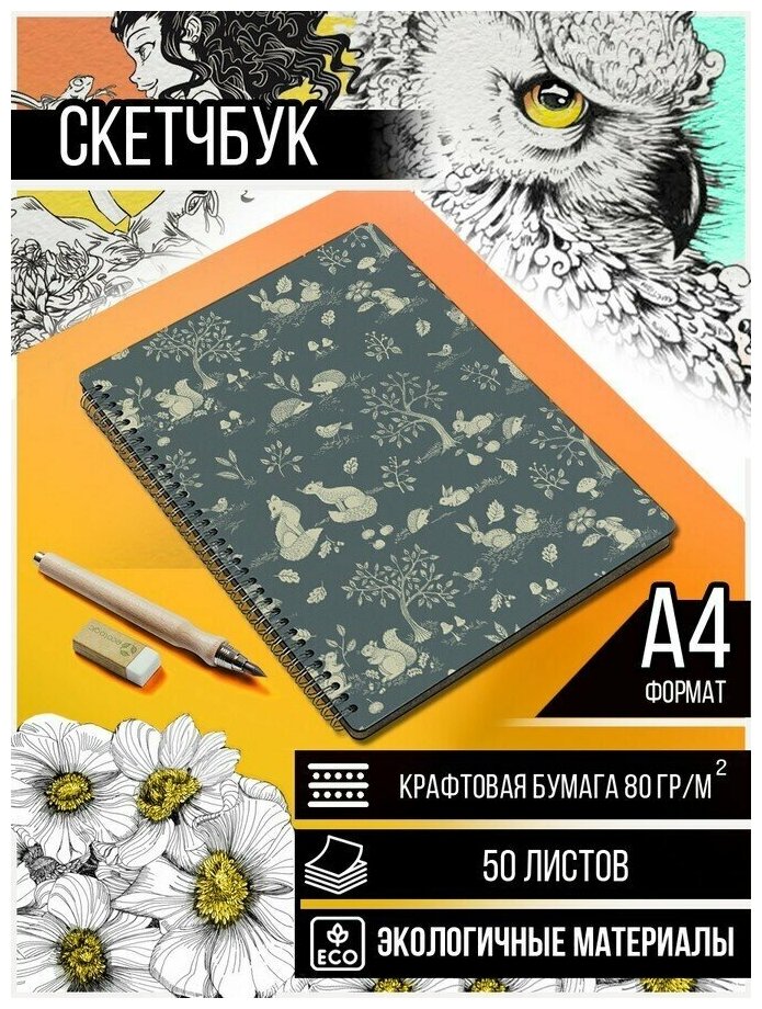 10 цен на Скетчбук, Блокнот для рисования A4 50 крафт листов животные - 1089