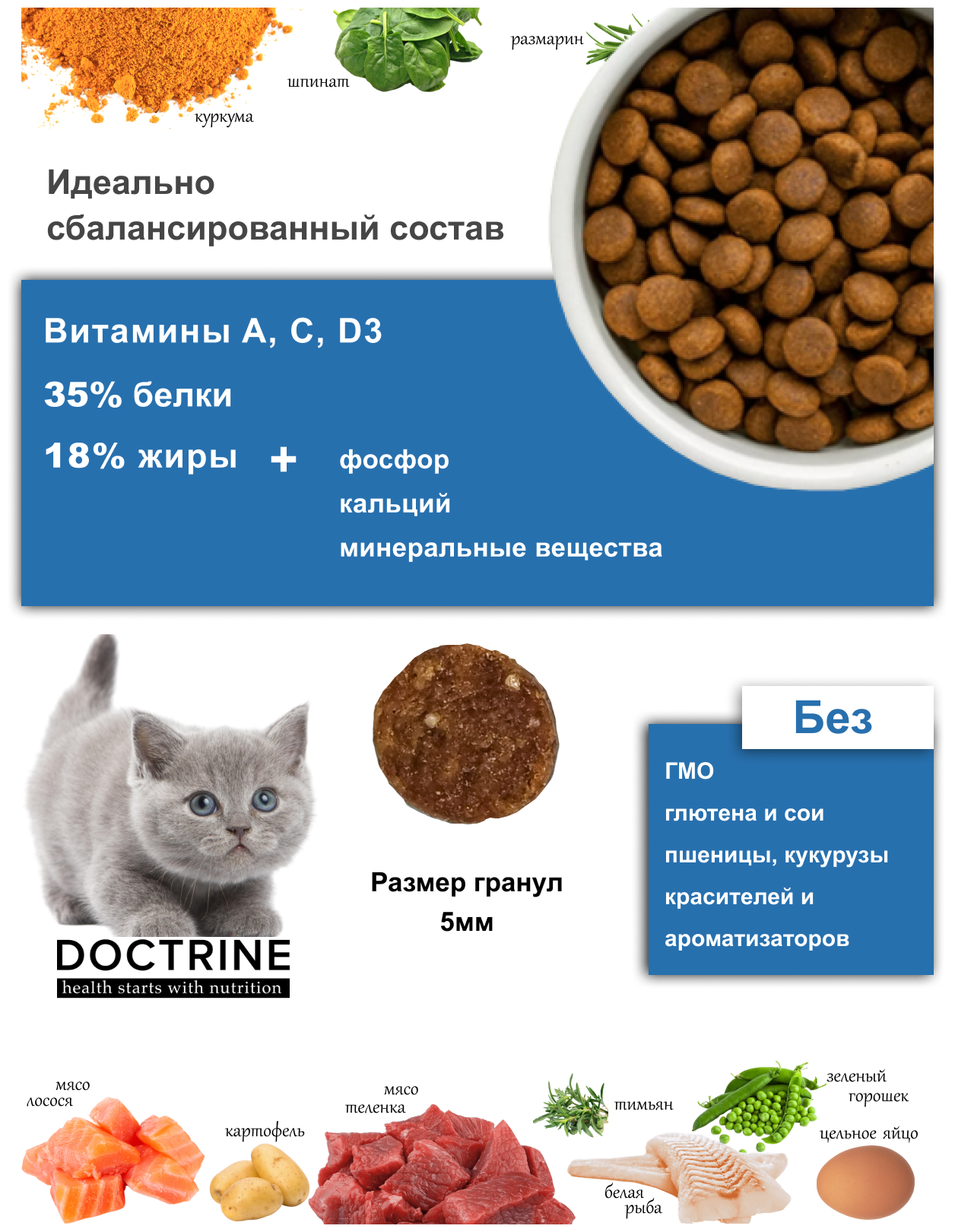 Сухой беззерновой корм DOCTRINE для котят с лососем и белой рыбой, 10 кг информация: