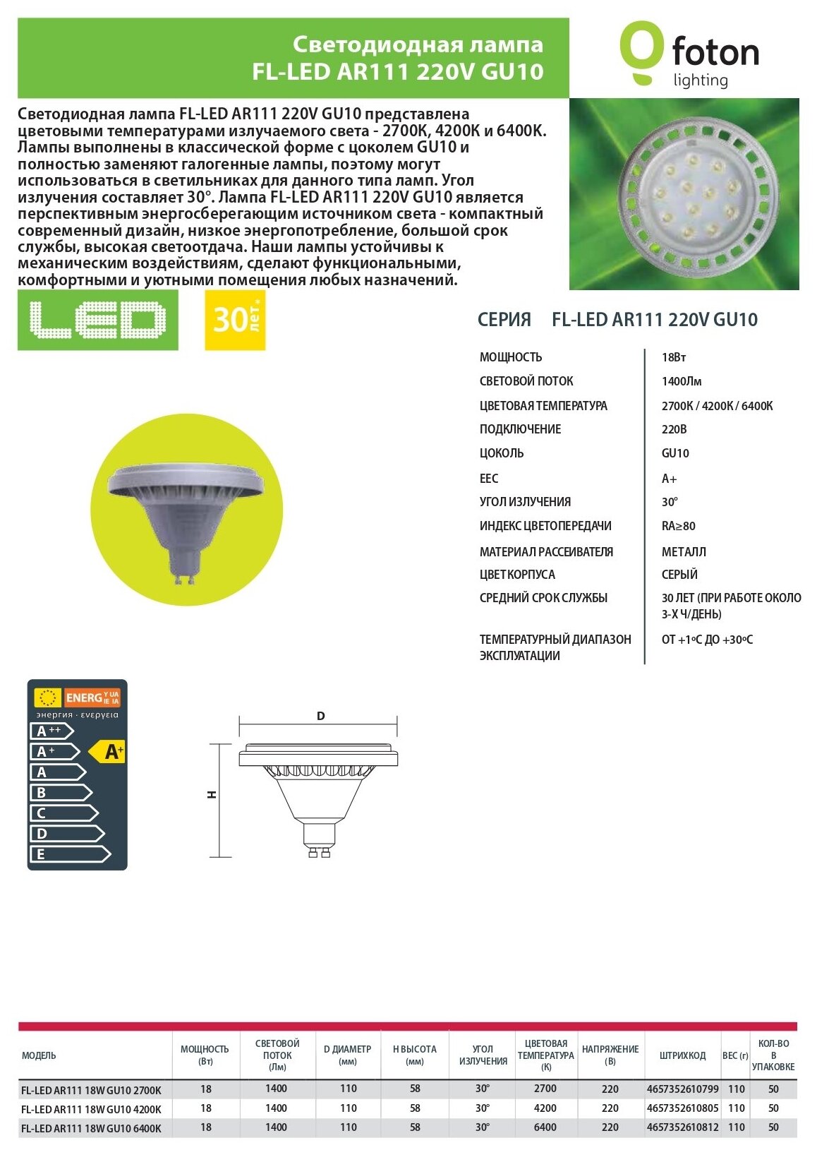 Лампочка светодиодная Foton Lighting Софит AR111 GU10 18Вт 220В 1400Лм 6400К Холодный белый, упаковка 3шт информация: