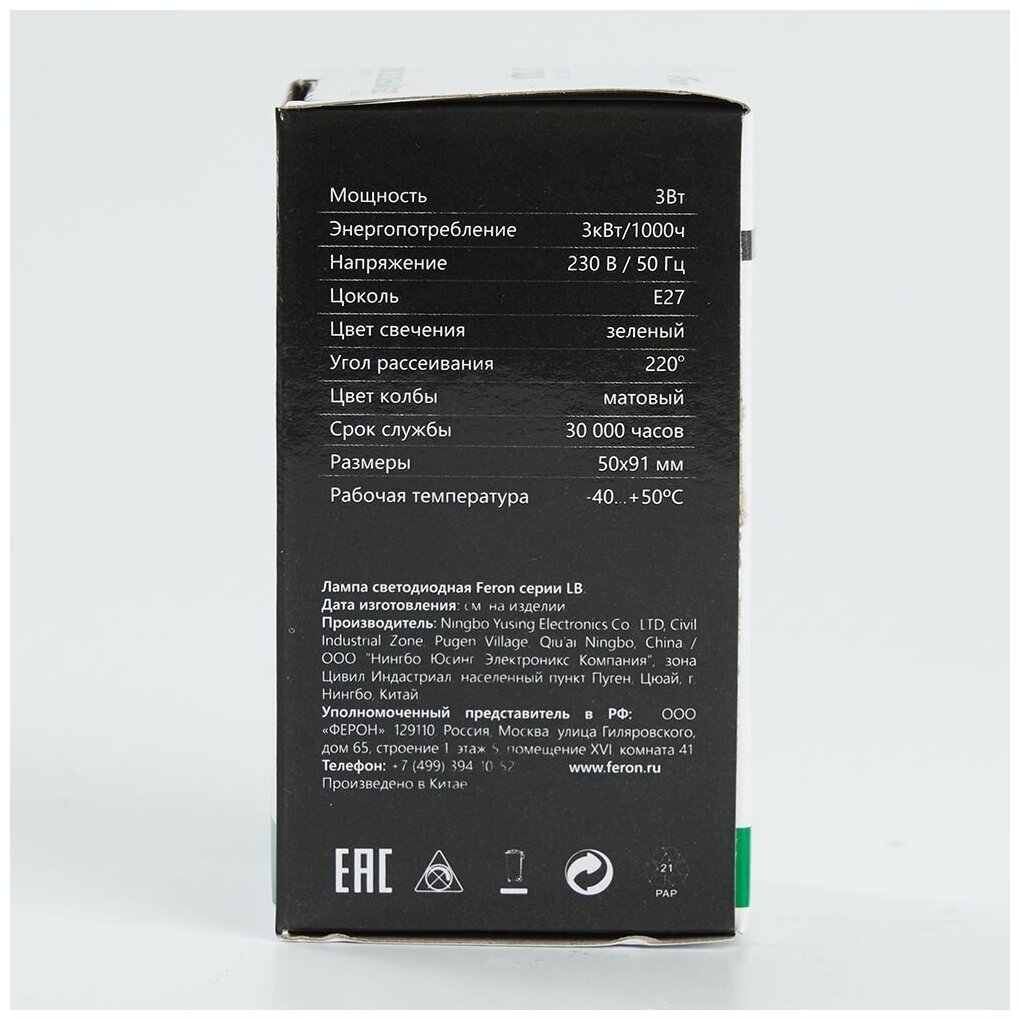 Лампа светодиодная Feron LB-375 E27 3W зеленый информация: