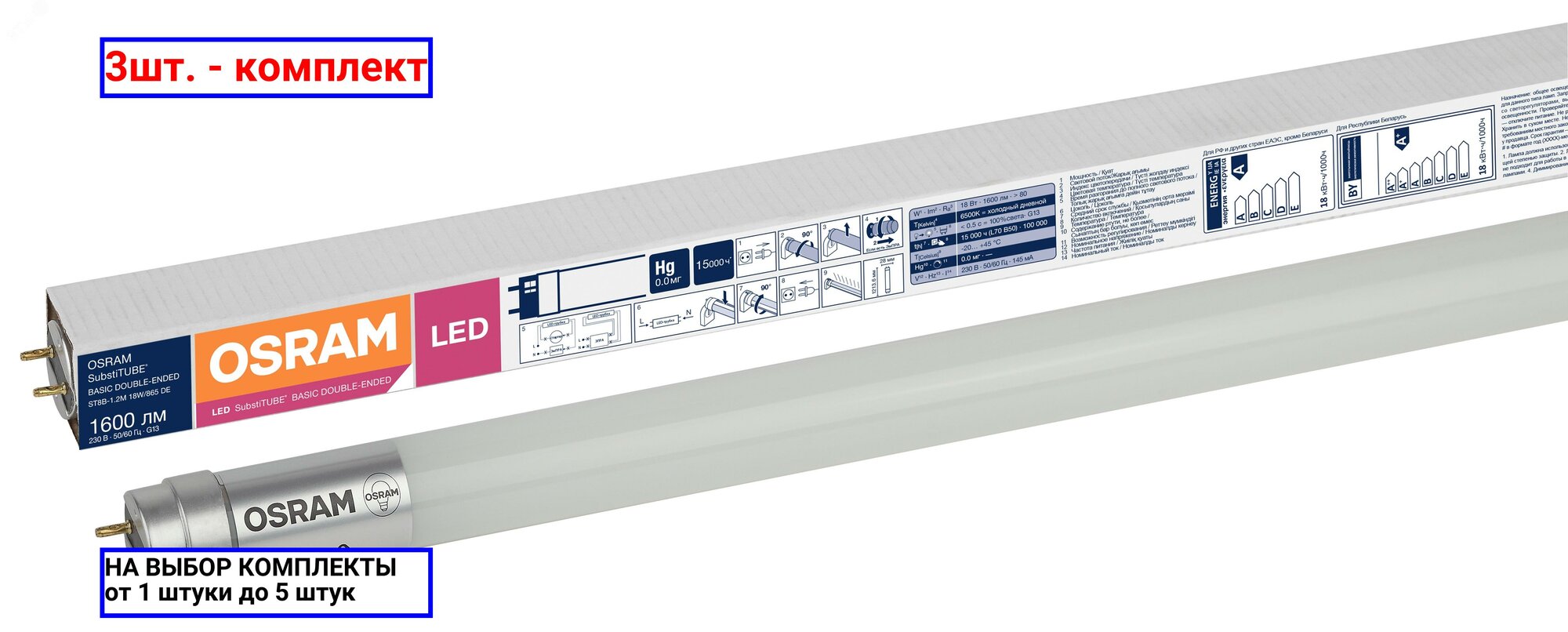Отзывы на Лампа светодиодная SubstiTUBE Basic T8 18W/865 (замена 36Вт) 18Вт трубчатая стекл. 6500К хол. бел. G13 1600лм 220-240В 1200мм двухсторон. прям. вкл. OSRAM 4058075377561 (3шт.в упак.)