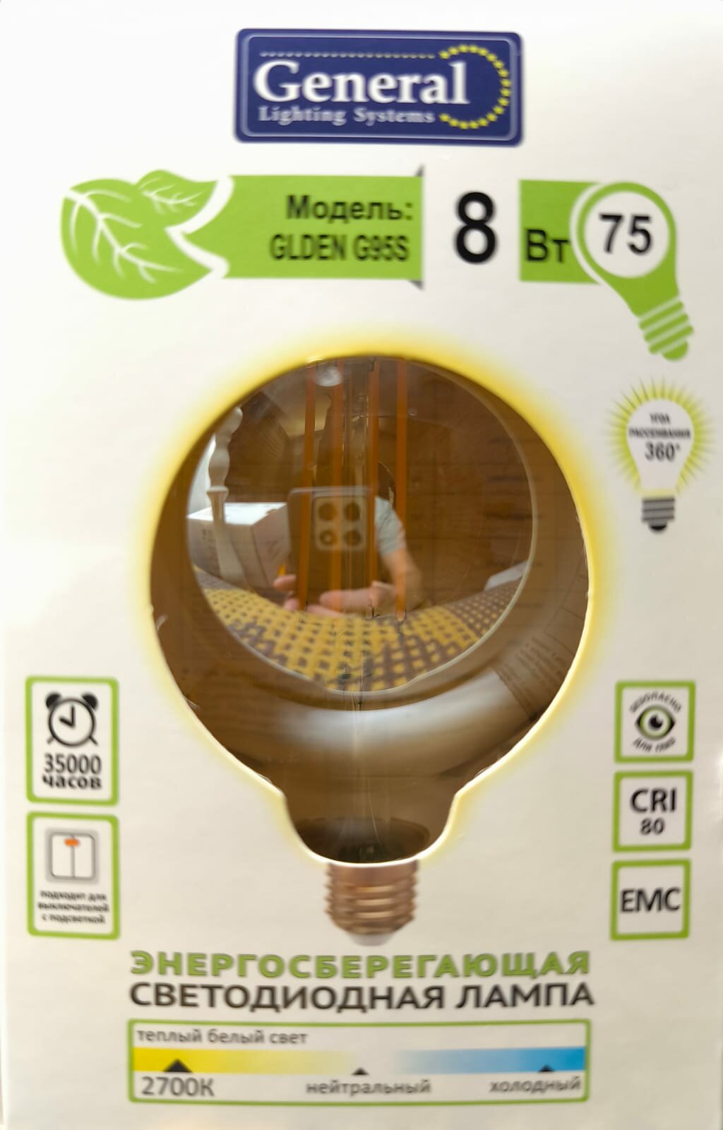 Отзывы на Светодиодная лампа Filament золотая G95 8Вт Теплый свет General GLDEN-G95S-8-230-E27-2700 Золотая