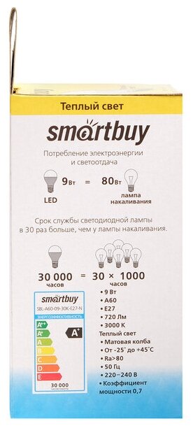 Лампа cветодиодная Smartbuy, E27, A60, 9 Вт, 3000 К, теплый белый свет информация: