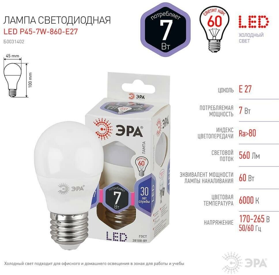 ЭРА Б0031402 Лампа светодиодная ЭРА LED P45-7W-860-E27 (диод, шар, 7Вт, хол, E27) информация: