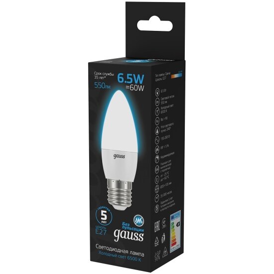 Светодиодная лампа Gauss Свеча 6.5W 550lm 6500К E27 LED 1/10/100 информация: