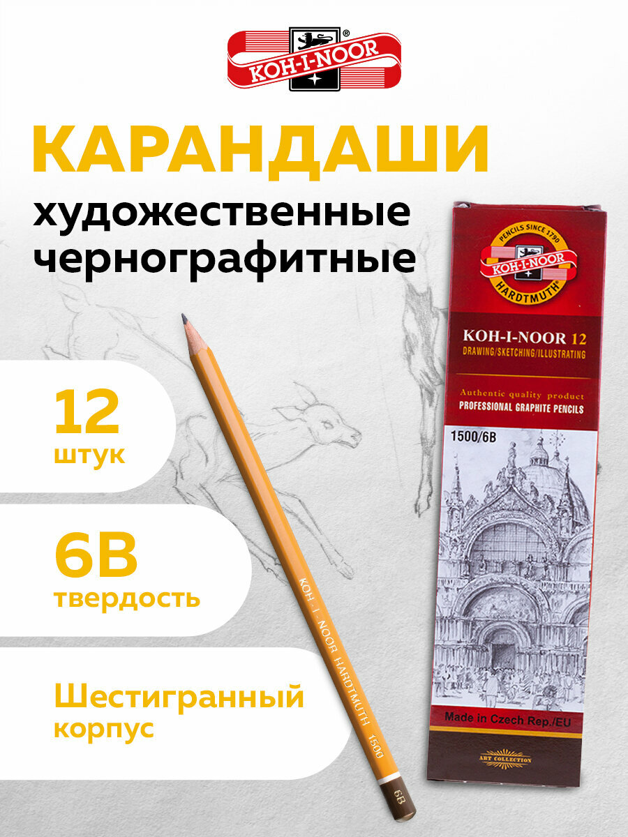 10 цен на Карандаши простые чернографитные 6B Koh-i-noor 1500, Комплект 12 штук, корпус желтый, 880476