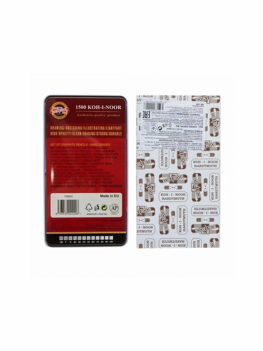 Набор карандашей чернографитных разной твердости 12 штук Koh-I-Noor 1500, HB-10H, в металлическом пенале 2 996 ₽