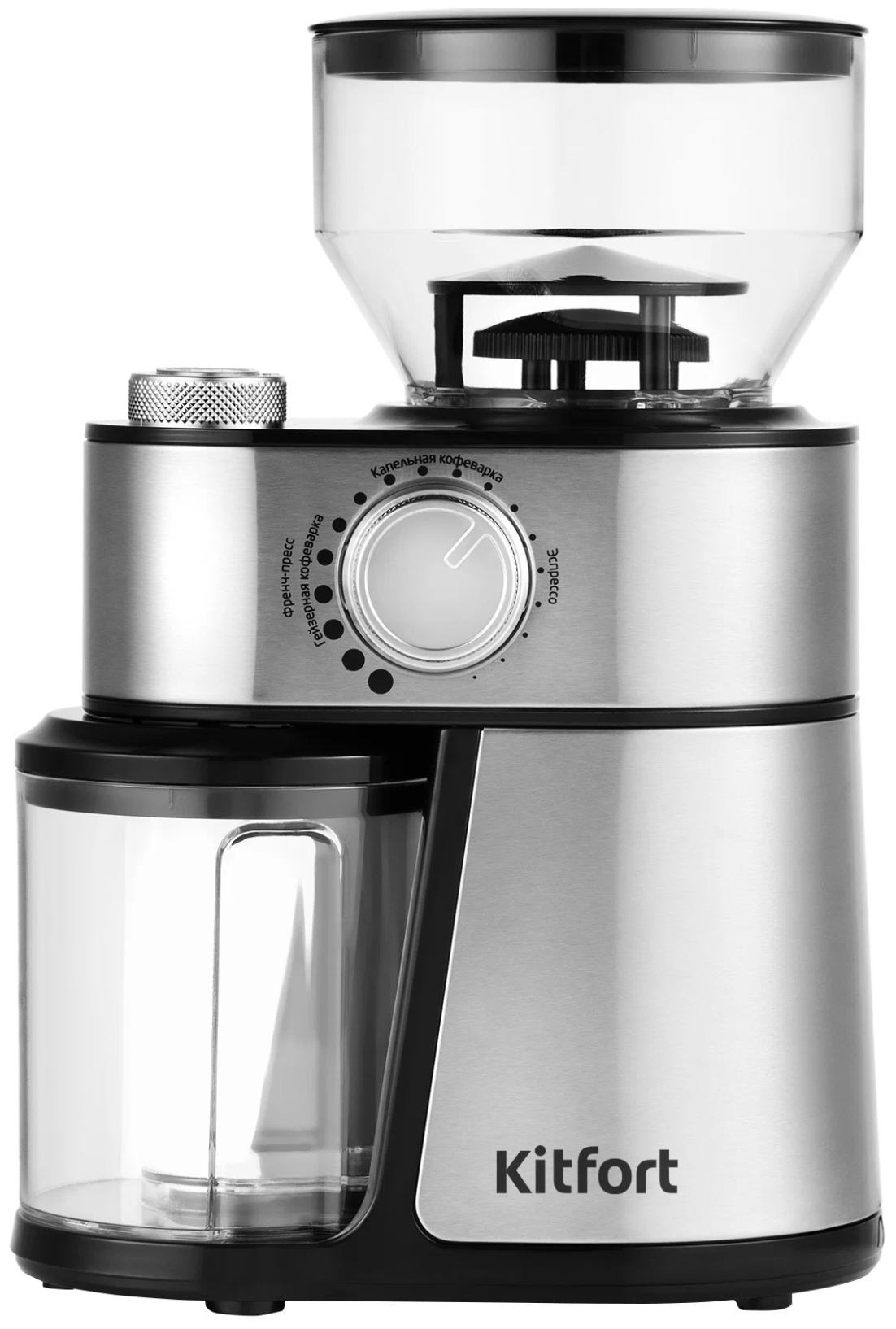 10 цен на Кофемолка Kitfort , вместимость 230 г, блокировка включения при снятой крышке, выбор порции помола, серебристый