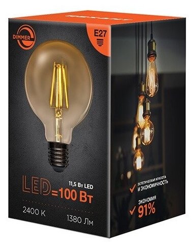 Лампа филаментная Rexant Груша A95, 11.5 Вт, 1380 Лм, 2400K, E27, диммируемая в золотистой колбе информация: