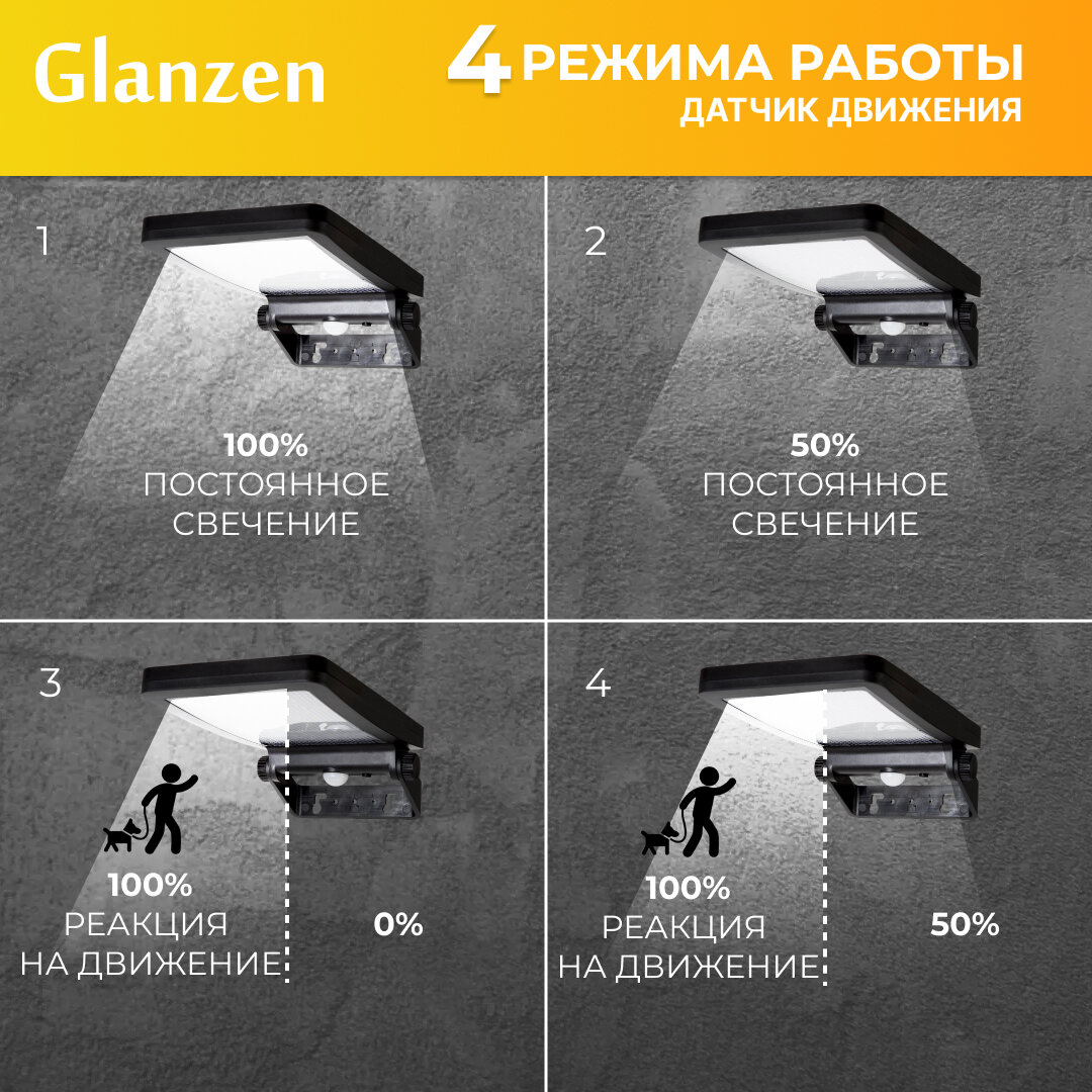 Светодиодный светильник на солнечных батареях с датчиком движения GLANZEN RPD-0002-3-solar 480 ₽