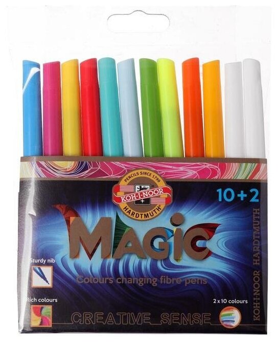 Фломастеры KOH-I-NOOR "Magic", 12 шт., 10 цветов + 2 перекрашивающих, смываемые, пластиковая упаковка, подвес, 771612AB01TE информация: