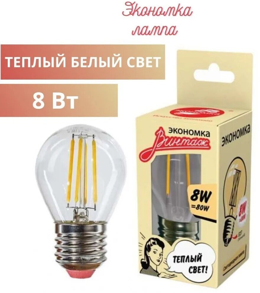 10 цен на Лампа светодиодная экономка Филамент 8Вт Шарик 45мм 160-260V Е14 720лм 2700K