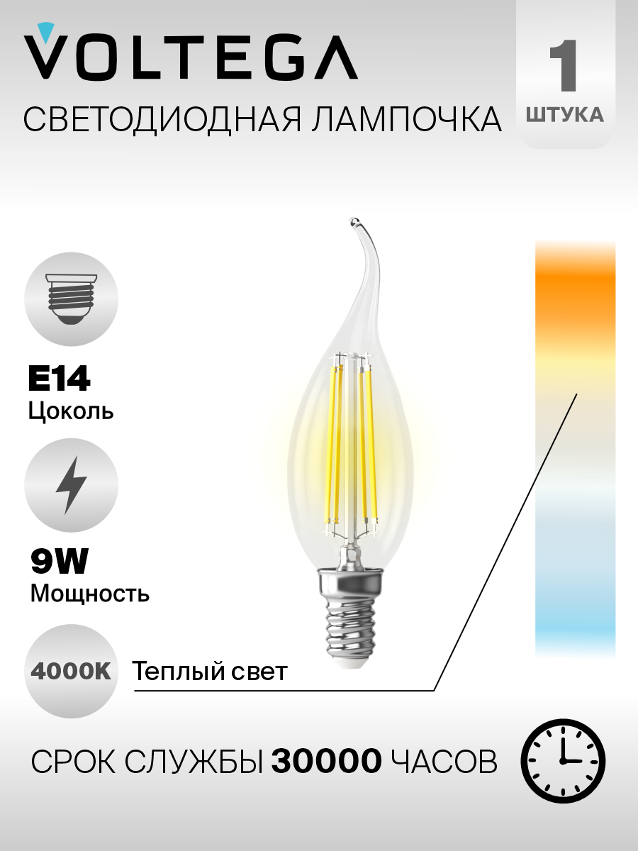 Лампочка светодиодная E14 форма свеча на ветру 9W нейтральный свет Voltega Crystal Graphene Candle wind 4000K 1 штука 220 ₽