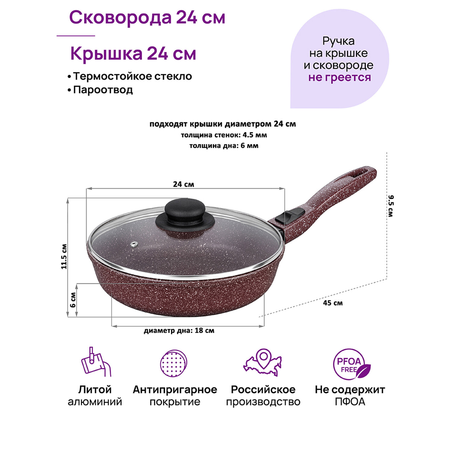 Сковорода глубокая 24 см Elan Gallery гармония вкуса Рубин с крышкой D24, со съёмной ручкой информация: