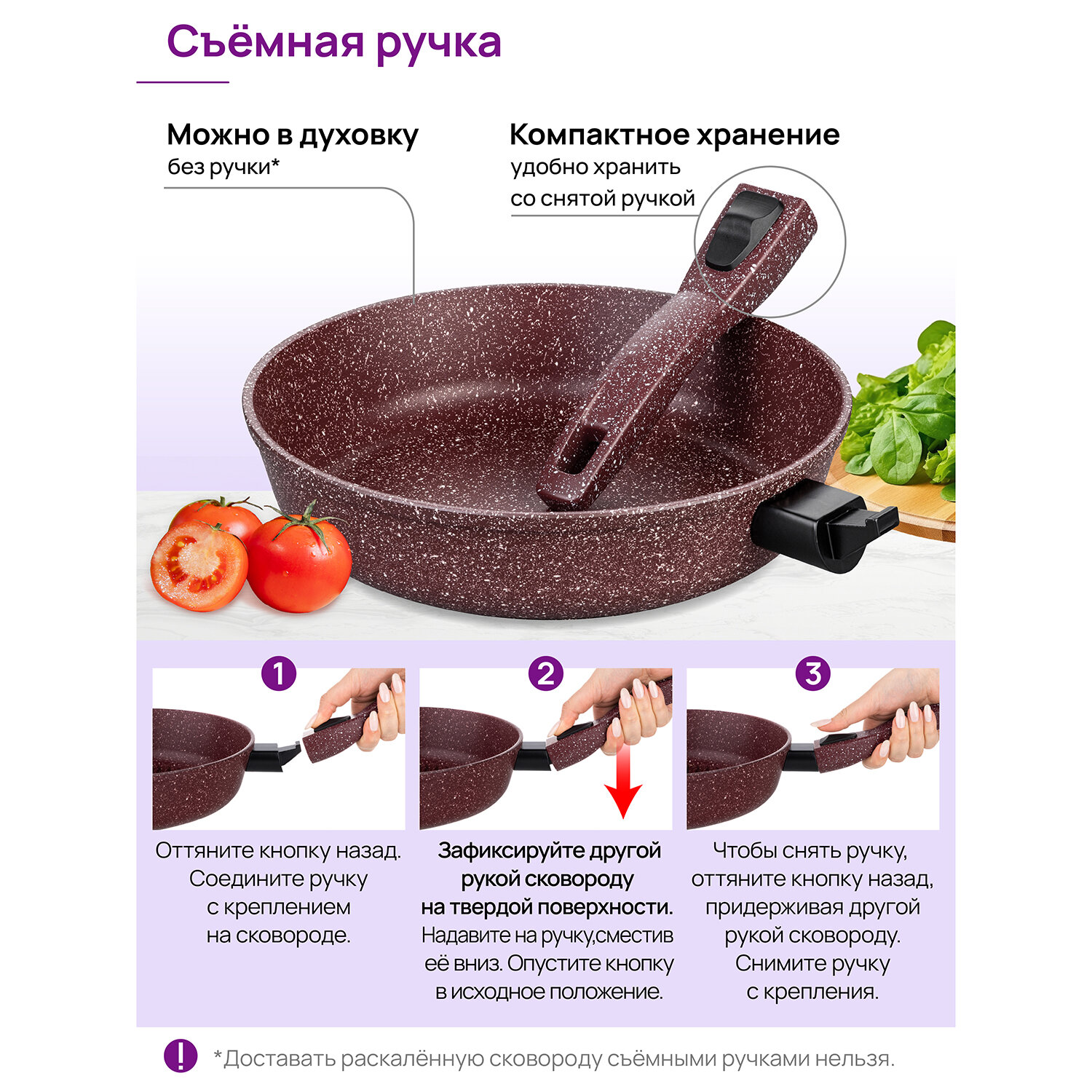 | Комплектация | сковорода, стеклянная крышка, съемная бакелитовая ручка |